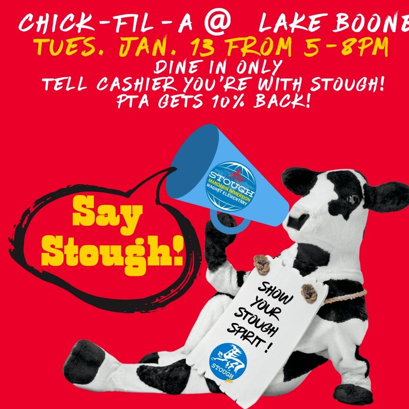 We're excited to partner with Chick-Fil-A @ Lake Boone Trail to host our first Stough Spirit Night of 2026 on Tuesday, January 13! Stop by the Lake Boone Trail location between 5-8pm to grab dinner for your family and support our school! Be sure to tell the cashier you are there for Stough! Chick-Fil-A will give 10% back to Stough PTA. We are grateful to the Chick Fil-A Team. for their support of Stough throughout the year. We hope to see you there on Tuesday!